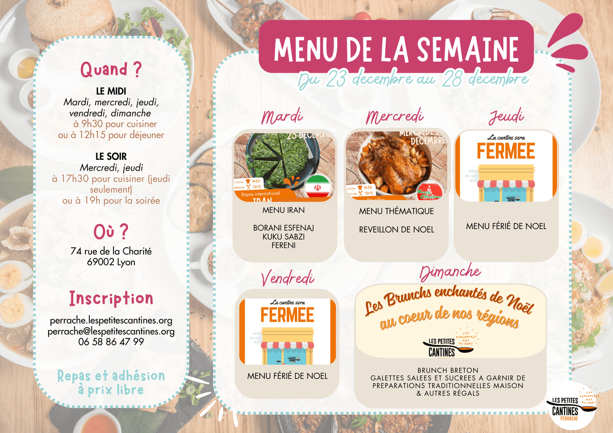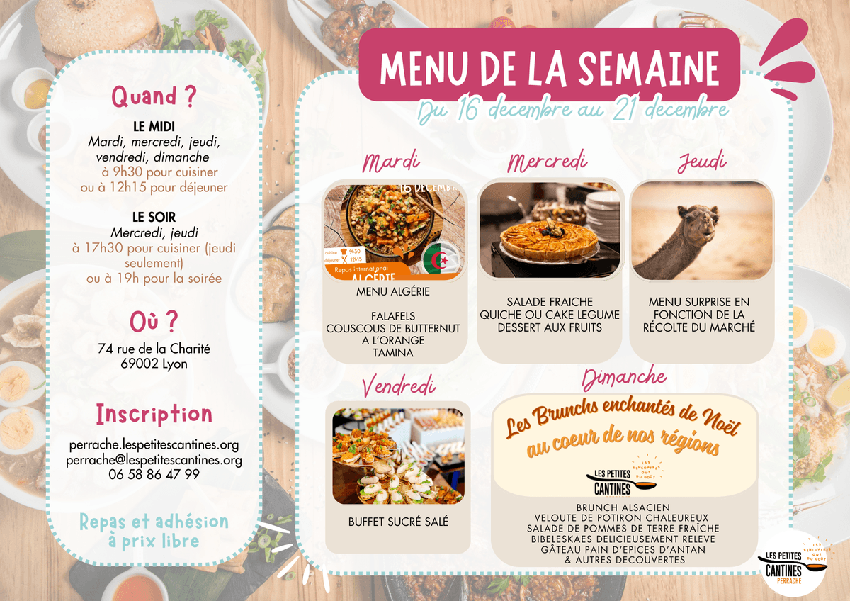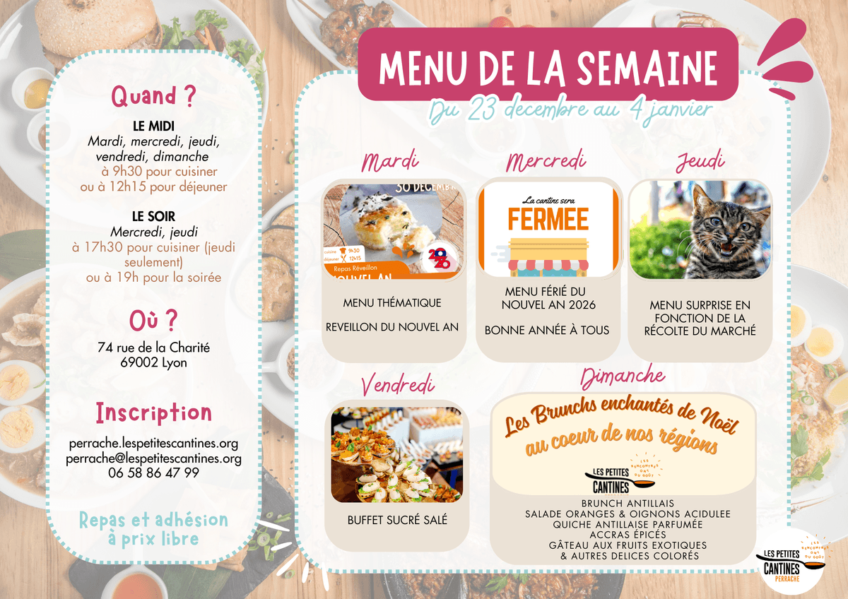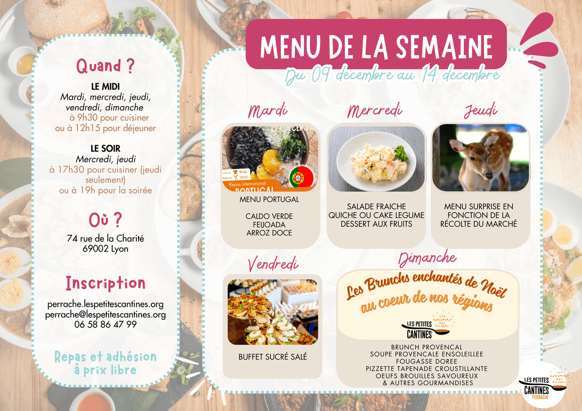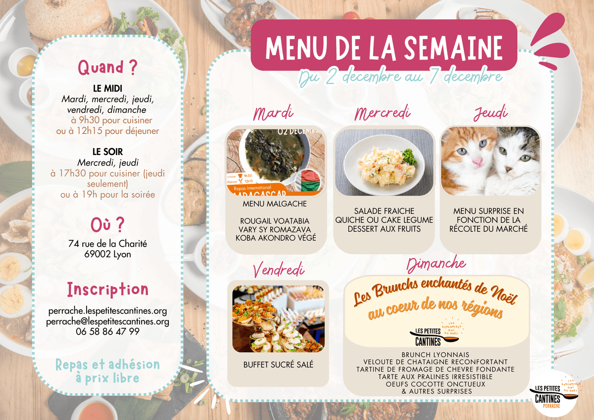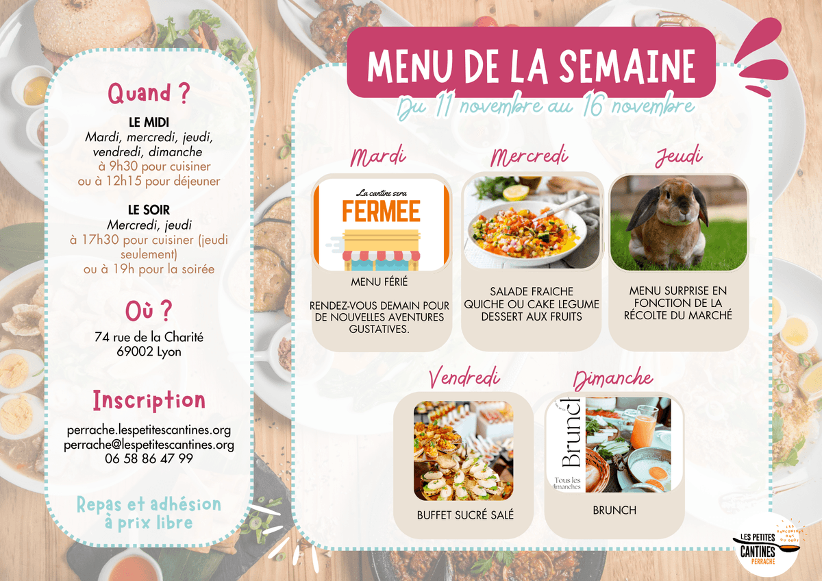 On le sait, tu aimes savoir ce qu’on va préparer… Cela dit, aux Petites Cantines on aime aussi les surprises : parfois, en fonction des invendus récupérés, le menu est différent de ce qui a été annoncé. La seule garantie : tu vas te régaler !